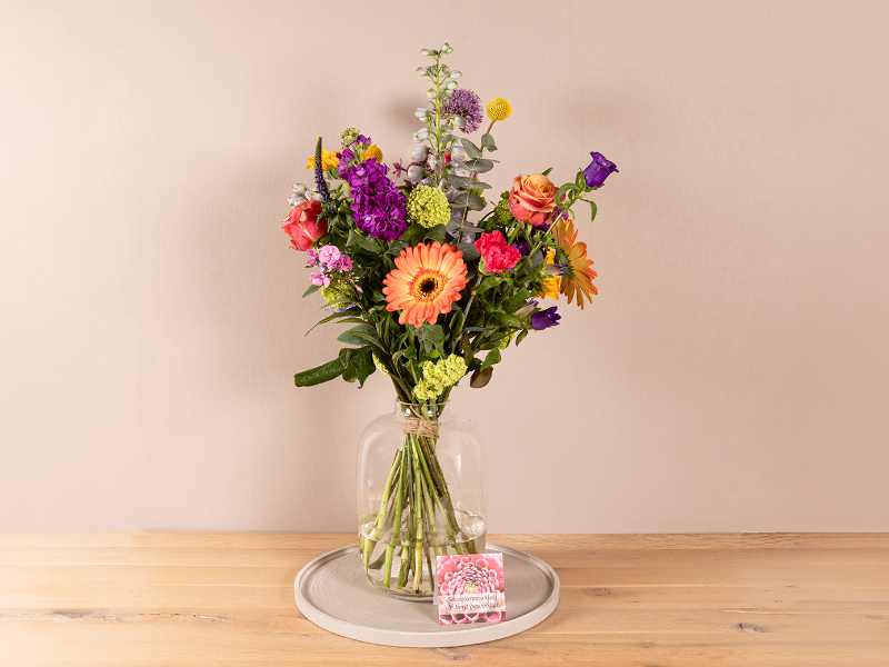 Vrolijk boeket met bonte kleuren, losjes geschikt met speels groen en hoogteverschil.