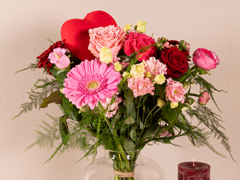 Valentijnsdagboeket bloemen in roze en rode tinten met hartsteker.